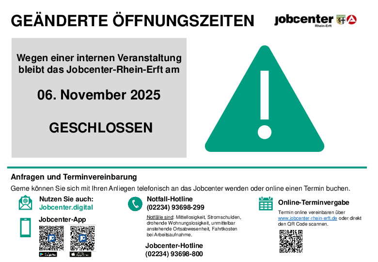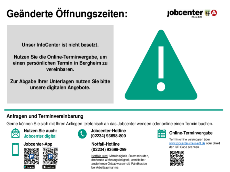 Seit dem 14. Januar 2025 können Bürgergeldbeziehende über die neue Jobcenter-App Anträge stellen, Unterlagen schicken und Veränderungen direkt mitteilen – natürlich datenschutzkonform. Nahezu alle Anliegen können ab jetzt über die neue Jobcenter-App erledigt werden. Damit wird die Jobcenter-App zum bevorzugten Kommunikationsweg der Zukunft. Die Jobcenter-App ermöglicht einen einfachen, mobilen und barrierefreien Zugriff auf die online verfügbaren Angebote des Jobcenters. Ab sofort steht die Jobcenter App für mobile Endgeräte im AppStore und bei Google Play (Suchwort "Jobcenter APP") zum Download bereit.